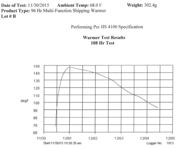 The 96 hour heat pack will activate in approximately one hour, and reach its peak surface temperature of 140°F (60°C) in approximately 9 hours. The temperature of the heat pack will then gradually decrease and maintain at approximately 100°F (38°C) for majority of of its operational life.