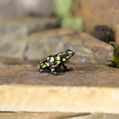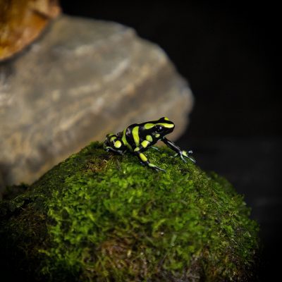 It is common for a healthy auratus Colombian Yellow to live 20+ years in a vivarium, although up to 15 years is more reasonable. Please consider this before deciding to take them home to your family. As with most amphibians they are considered a “hands off” pet similar to a fish. Due to their delicate and permeable skin, it is not advised to handle your frogs. The chemicals, oils and debris on your hands could prove fatal to your dart frog pet when it is absorbed through their skin. It is recommended that you wear powder free rubber gloves if you are required to handle your dart frogs. In an emergency, such as an escape from the enclosure, try to capture them as fast as possible (bare hands will do… if needed) as they will try to hide quickly, and unfortunately this will become fatal very rapidly.