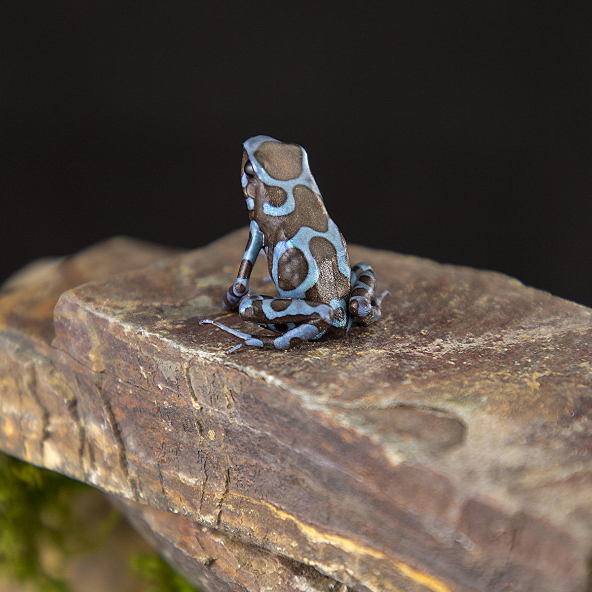 Like all auratus, the Super Blue frogs are diurnal meaning they are awake during the day. They are terrestrial and live in the understory of the jungles they inhabit. In the wild they are constantly foraging for small insects, invertebrates and arthropods in the leaf litter. Some of the plants in the jungles contain various alkaloids and toxins, the micro fauna eat these plants and in turn get eaten by the frogs. This causes a downstream effect and these amazing frogs have evolved to harness the toxins as a means of self-defence. A combination of their striking colors and the toxins stored in their glands help ward off potential predators. In captivity the auratus do not contain any of these toxins due to the diet provided to them. They don’t have access to the food they would be eating in the wild. Super Blue live near streams and can be found soaking in shallow ponds or right on the edge of slow moving water. While being frogs they are not very good swimmers and great care should be taken when making a suitable vivarium for them to live in. Once mature, the males will boldly perch on a rock or log and call out to attract females. The auratus call is a combination of a purr, a buzz, and a long squeak. It’s quite soft and will not bother sensitive ears. When a female selects a male, she will caress and gently pet his back to tell him she is ready to mate. The male will then hop away to a nice quiet place, with the female close behind. Typically auratus can be housed communally, but occasionally you may have to remove a bully.
