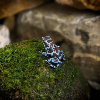 Dendrobates auratus ‘Super Blue’ are a line bred frog, with breeders selecting the most turquoise and the most bronze frogs and breeding them together. Like the other auratus frogs, Super Blue are diurnal so they will be awake during the day so you can watch them go about their froggy business. Line breeding started around 2005, and is still going strong today, resulting in some phenomenally colored frogs that still have the care and requirements of their easy auratus relatives.