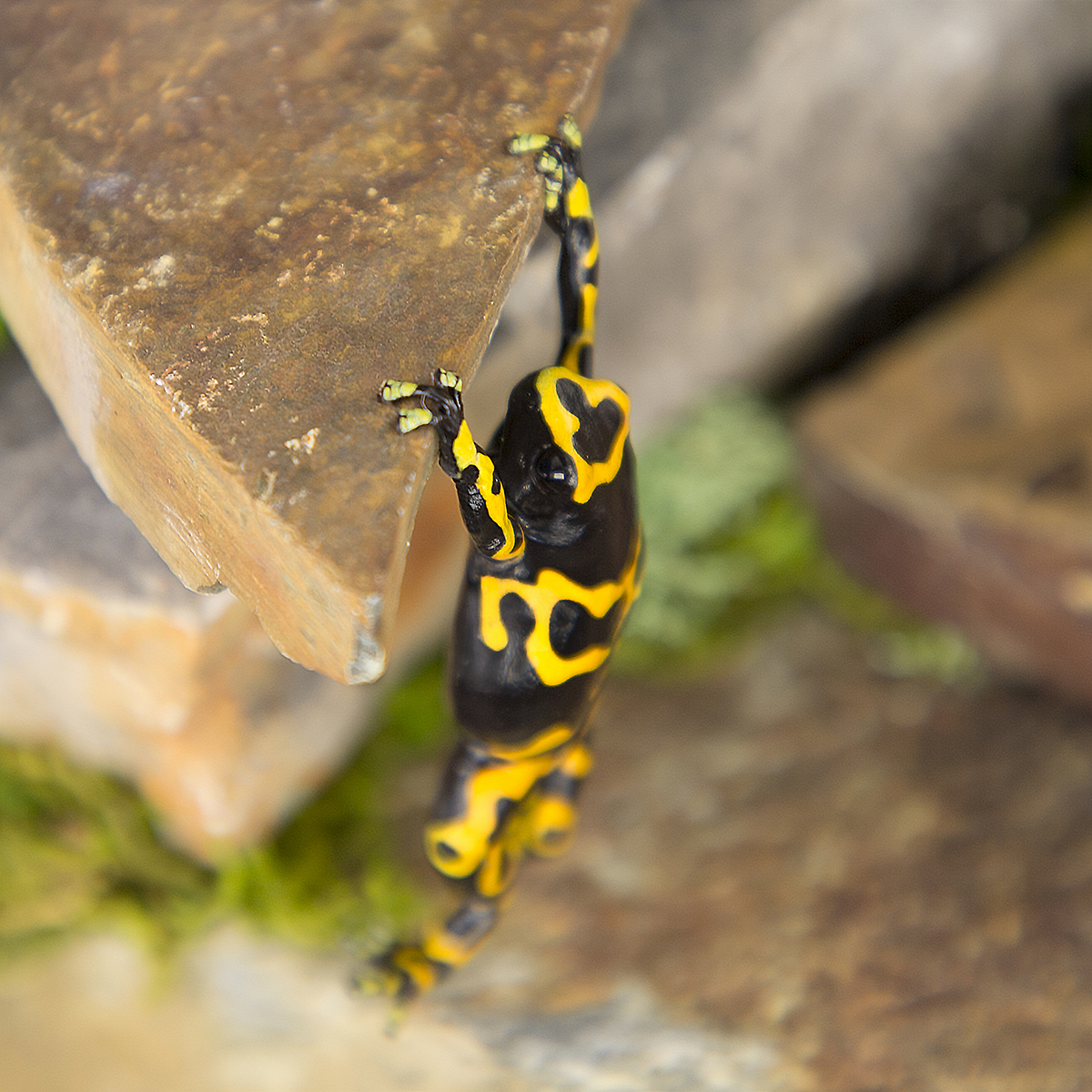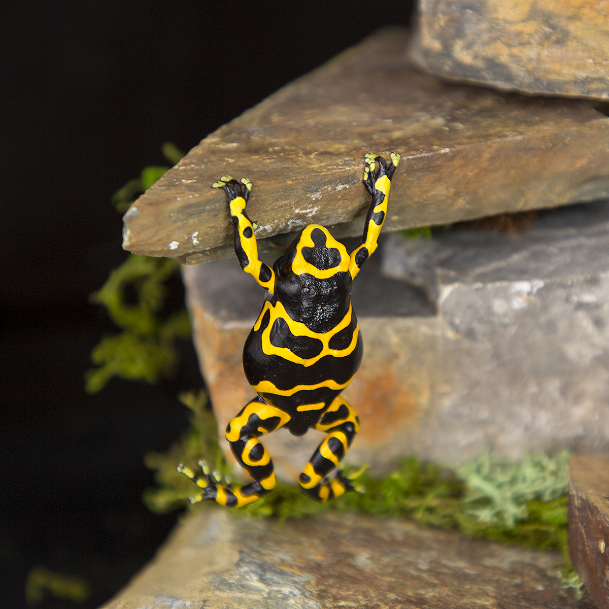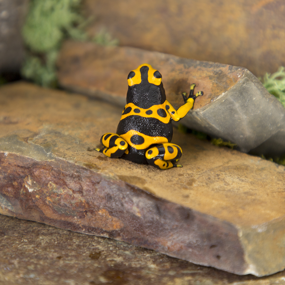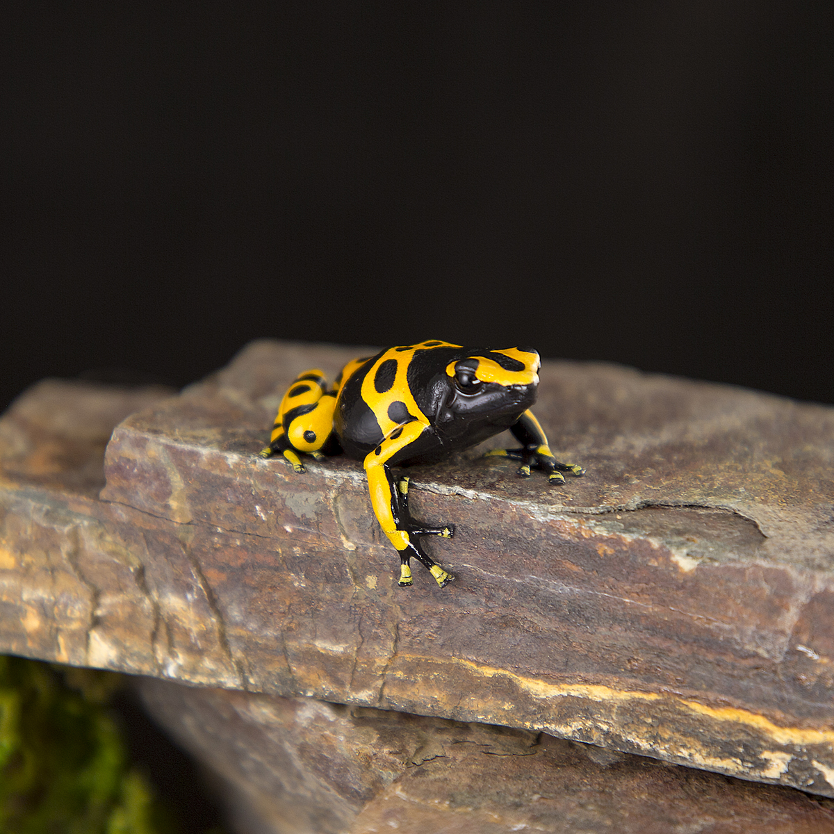 Like all leucomelas, the Standard frogs are diurnal meaning they are awake during the day. They are terrestrial and live in the understory of the jungles they inhabit. In the wild they are constantly foraging for small insects, invertebrates and arthropods in the leaf litter. Some of the plants in the jungles contain various alkaloids and toxins, the micro fauna eat these plants and in turn get eaten by the frogs. This causes a downstream effect and these amazing frogs have evolved to harness the toxins as a means of self-defence. A combination of their striking colors and the toxins stored in their glands help ward off potential predators. In captivity the leucomelas do not contain any of these toxins due to the diet provided to them. They don’t have access to the food they would be eating in the wild. Standard luecs live near streams and can be found soaking in shallow ponds or right on the edge of slow moving water. While being frogs they are not very good swimmers and great care should be taken when making a suitable vivarium for them to live in. Once mature, the males will boldly perch on a rock or log and call out to attract females. The leucomelas call is loud and unique, and sounds like a bird call. It is a few seconds long and monotone, singing “ti-i-i-i-i-i-i-i-i-” rapidly in succession for any mates to hear. When a female selects a male, she will caress and gently pet his back to tell him she is ready to mate. The male will then hop away to a nice quiet place, with the female close behind. Leucomelas females and males typically get along fairly well and can be cohabitated with others of the same locale, but remember to increase your vivarium size by about a foot for every additional frog.