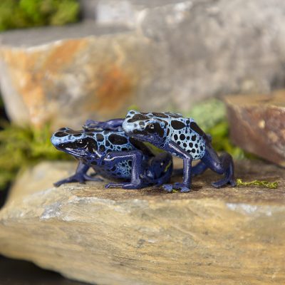 Dendrobates tinctorius New River dart frogs can be rather variable in both color and markings. Their base color is light blue or cream, and this is displayed on their heads and backs. This base color is layered with dark blue or black patterning, which presents as spotting, flecking, splotching, or striping. The legs tape from the base color into the blue or black (or both!) of the layer color and blue legs can be covered in black spots. New River are large for a tinctorius. Females measure in at about 56mm (2.2 inches), with males being slightly smaller at 44mm (1.75 inches). Males often appear smaller than females, who are both wider and longer. Usually the male’s front toe pads are wider and the arch in the back is less defined than the female’s. All New River frogs share the common hunchback pose and bulldog stance the tinctorius species is known for.