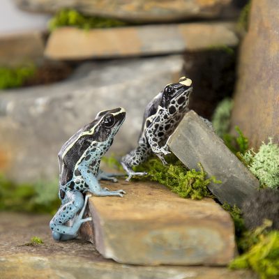 Dendrobates tinctorius Powder Blue are vibrant black and yellow frogs with amazing mottled powder blue or powder grey legs. Like the other tinctorius frogs, Powder Blue are diurnal so they will be awake during the day so you can watch them eat and hop around. Introduced in 1994 from Suriname, these dart frogs are great starter frogs, or an excellent staple in an already well rounded collection.