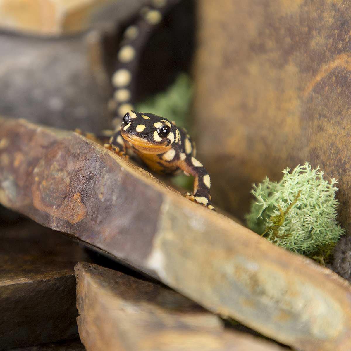 Neurergus crocatus (Pronounced new-rer-gus crow-cat-us), known as the Yellow Spotted Turkish Newt, are black newts with yellow polka dots. Easy to care for and a reasonable size at about 10cm (4 inches), these newts are great for a keeper who is interested in a semi-aquatic species. Needing both water and land in their tanks, these unique little newts have not proven to breed well in captivity, but individuals do well and can live for well over 20+ years!