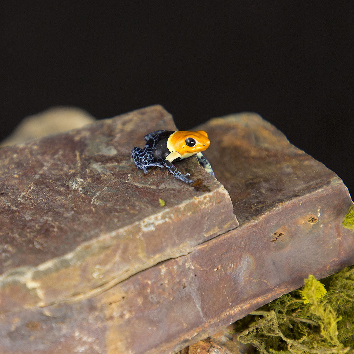 Ranitomeya fantastica ‘True Nominal’ (pronounced Ran-it-oh-may-ah fantastic-ah) are orange, yellow and blue frogs, with black patterning. Being a Ranitomeya frog, True Nominal are very small, only the size of your thumbnail. These little fellas are rocket-fast and can be a bit on the shy side, but may warm up to you if you visit them through the glass a lot. They are diurnal like all Ranitomeya, so you won’t have to get up late to watch them. They should be active when you are! Introduced as early as the 90s, care for these thumbnail frogs is considered moderate.