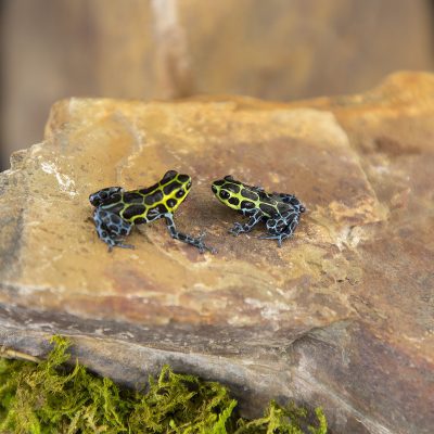 Ranitomeya variabilis “Southern” (pronounced Ran-it-oh-may-ah var-ee-ah-bill-iss (sss like a snake) are yellow, lime, forest green, and blue in color. Being a Ranitomeya frog, Southern are small, about the size of your thumbnail. These little frogs are quick and can be a bit on the shy side, but may warm up to you if you visit them through the glass a lot. They are diurnal like all Ranitomeya, so you won’t have to get up late to watch them. They should be active when you are! These are easy to care for and make a great beginner frog.