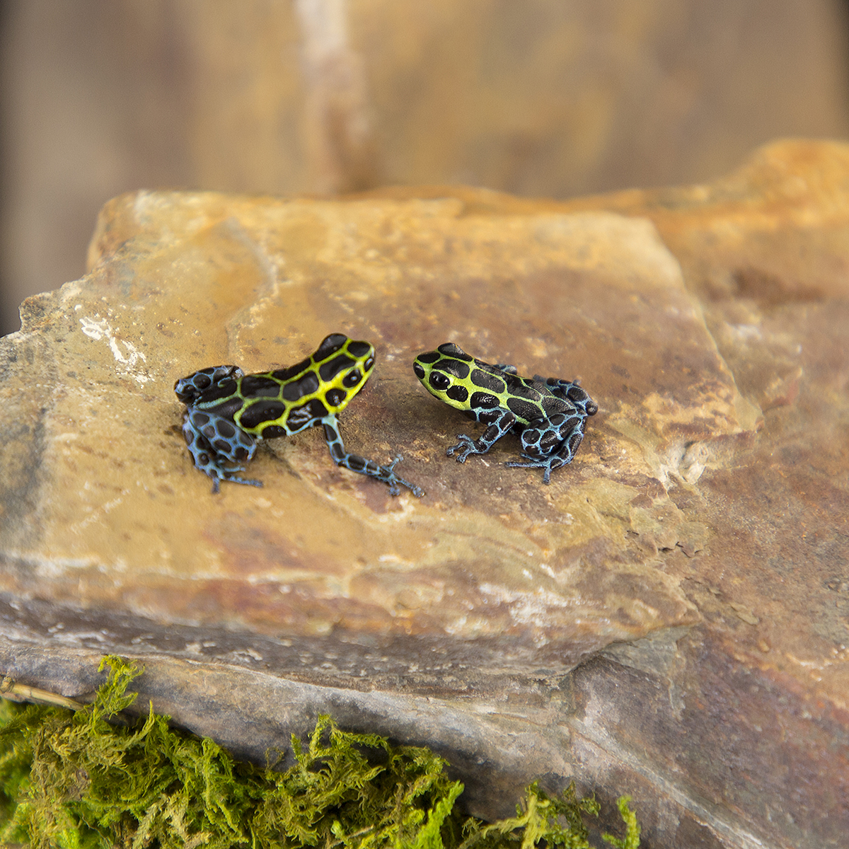Ranitomeya variabilis Southern have it all!  Green, blue, yellow, and black, variabilis Southern is a crowd pleaser!  Easy to care for, busy during the day, quiet, and small, these frogs will make any amphibian lover very happy!