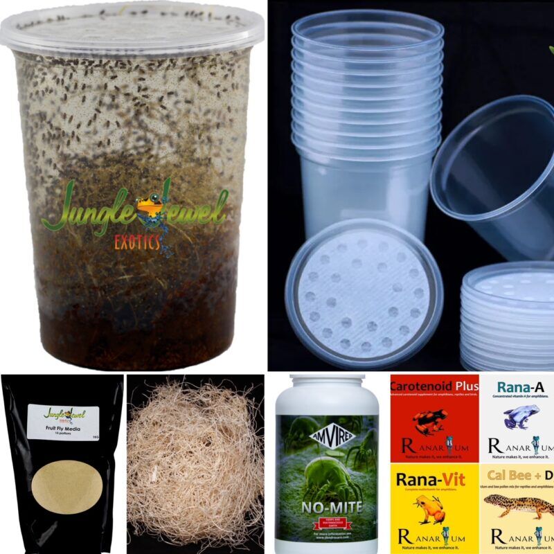 Then you add your culturing components including our very own Fruit Fly Media, Cups, Lids, Excelsior and No-Mite dust.