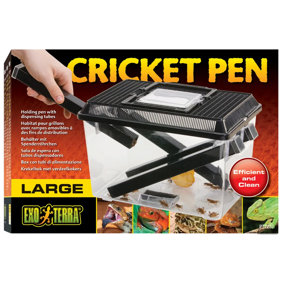 The Exo Terra Cricket Pen is ideal for housing, keeping and dispensing live crickets. Crickets prefer dark spaces, and will readily crawl into the tubes which provide hiding places for them, making it easy to use the tubes as dispensing tools. The tubes remain in position when the lid is removed, allowing easy access and less chance of cricket escape. Simply pull out a tube, shake a few crickets into the terrarium or feeder, and replace the tube back into the cricket pen.
