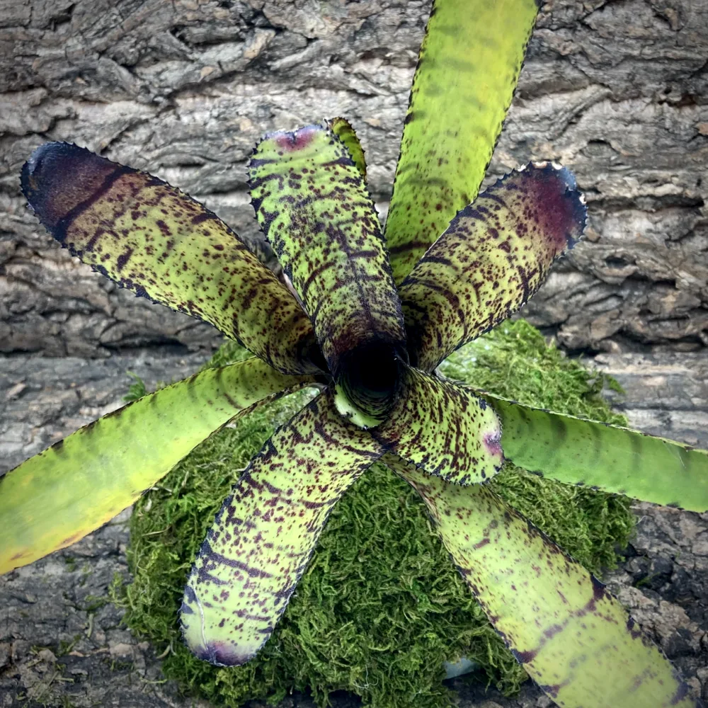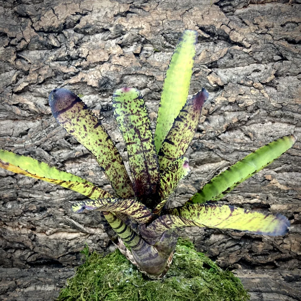 Neoregelia Bromeliads are typically found in the canopy of a rainforest and are considered to be a epiphyte, as such they do not require to be planted directly into the soil. They will gather their nutrients from the rain water and animal droppings left on their leaves.