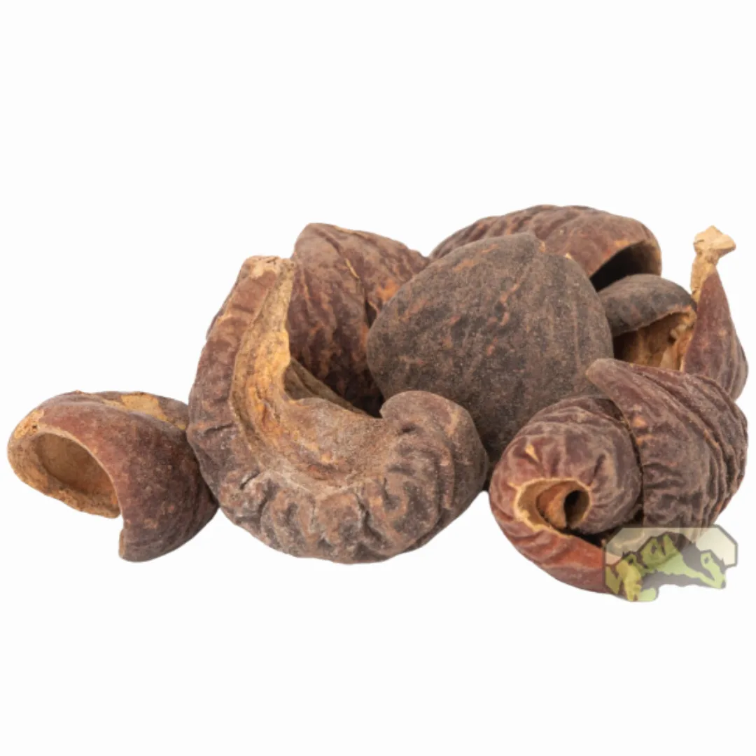 They are a thick woody seed pod that’s dimpled on the outside and smooth on the inside. These pods hold their curved shape when used in a humid terrarium or submerged in an aquarium. Shrimp love these as they create a tasty biofilm.