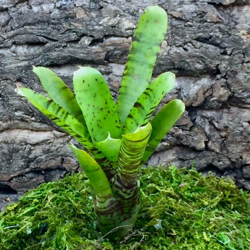 Mini Neoregelia Bromeliads stay relatively small, however do vary in size from 4-6″. They are hardy and an excellent plant that’s suitable for all types of humid terrariums and vivariums. Mini Neoregelia Bromeliads grow in the canopy of a rainforest and are considered epiphytes, as such do not plant these bromeliads directly into the soil. They will gather their nutrients from the rain water and animal droppings left on their leaves. Bromeliads can vary a lot in their colours depending on their hybrid, as well as the quality of light you provide. Bromeliads that are placed under a high intensity plant growing light will show off more of their vibrant colors. Whereas bromeliads under less intense lighting will show off more green.