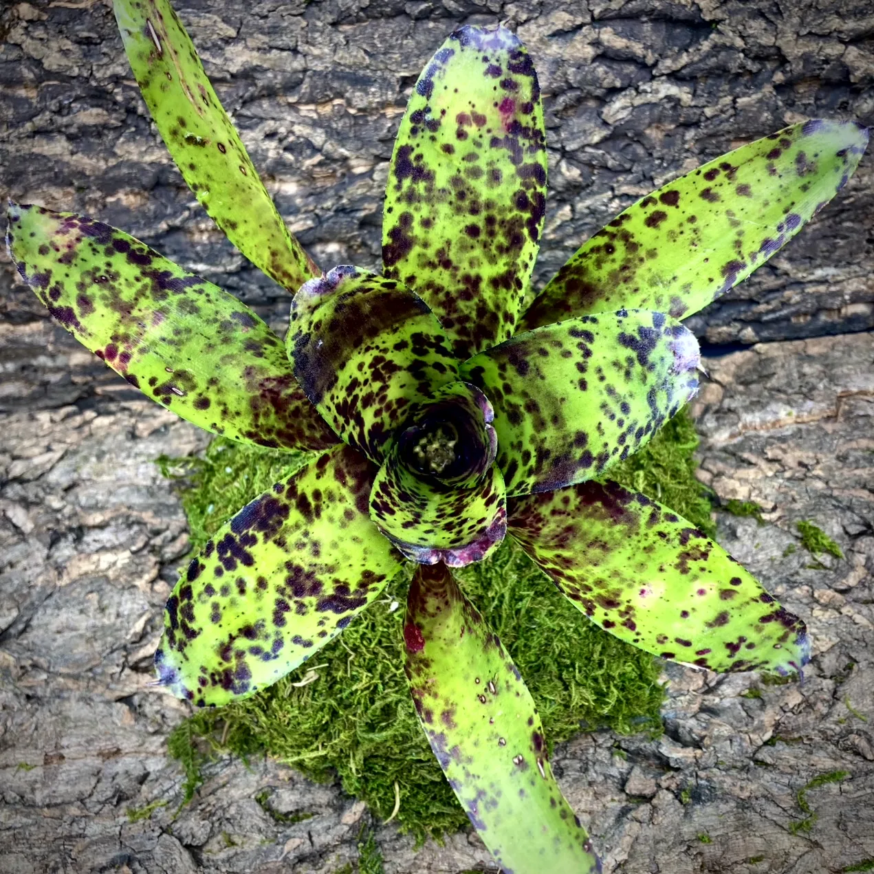 Neoregelia Bromeliads are typically found in the canopy of a rainforest and are considered to be a epiphyte, as such they do not require to be planted directly into the soil. They will gather their nutrients from the rain water and animal droppings left on their leaves.