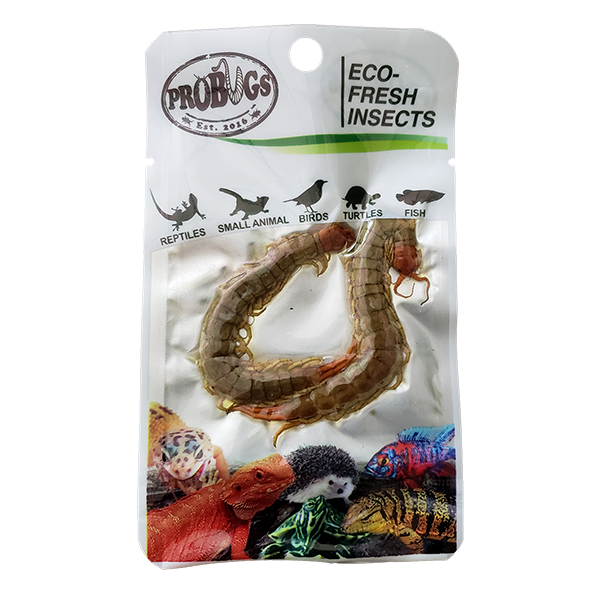 ProBugs Eco-Fresh Centipede (Scolopendra subspinipes) are an interesting feeder insect for reptiles, fish and other small animals. These centipedes are typically 4-8 inch (10-20cm) long and about 0.5 Inch (1.25 cm) wide. There colours may range from yellow, red and brown. Since these are fresh preserved they include all the legs, antennae, and even their hook like jaws. Centipedes are a great color enhancer for Asian Arowana. The small amounts of venom in the stinger helps breakdown the protein faster, so the fish can absorb all the nutrition value. Centipedes are also high in protein, which is great for many reptiles such as Bearded Dragons.