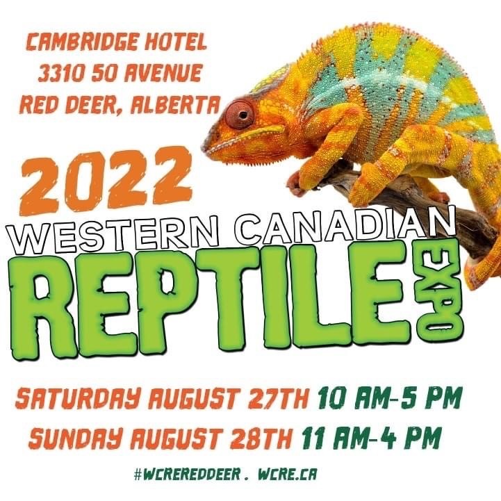 The Western Canadian Reptile Expo (WCRE) Returns to Red Deer, Alberta This weekend August 27-28 2022. The WCRE takes place at the Cambridge (Sheraton) Hotel and Conference Centre, 3310 50th Ave, Red Deer, Alberta. This event will host the largest gathering of Reptile and Amphibian breeders and enthusiasts in all of Western Canada.